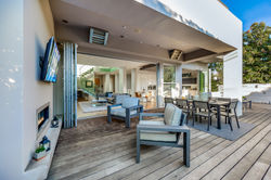 Located in the exciting Grove area of Los Angeles, with it's myriad of shops and attractions, this modern luxury villa serves as a perfect home base for exploring the sites of the surrounding area. Boasting 5 luxurious bedrooms and bathrooms, the modern airy style will delight your group. Vaulted ceilings, gleaming hardwood floors, neutral decor, and a magnificent floating staircase centerpiece, all add to the dramatic flair.